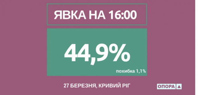 Станом на 16:00 явка виборців сягнула 44,9% (похибка - 1,1%). На повторному голосуванні за мера Кривого Рогу 15 листопада 2015 р. станом на 16:00 явка складала 28%.
