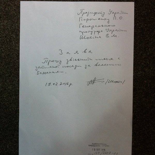 Представитель президента в парламенте Степан Кубив, докладывая с трибуны парламента, сообщил, что сам Шокин прислал в парламент письмо, которым попросил рассматривать этот вопрос без его участия.