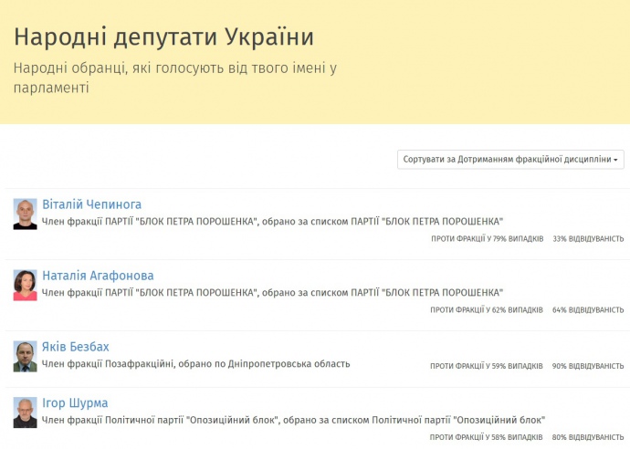 Так, среди лидеров оказался народный депутат Виталий Чепинога, который на днях объявил о выходе из фракции БПП, однако его заявление еще не зачитывали в сессионном зале. Он голосовал вопреки фракции БПП в 79% случаев. В частности, Чепинога не голосовал за скандальный "закон о партдиктатуре", также он числился отсутствующим 16 февраля при голосовании относительно отставки Яценюка.