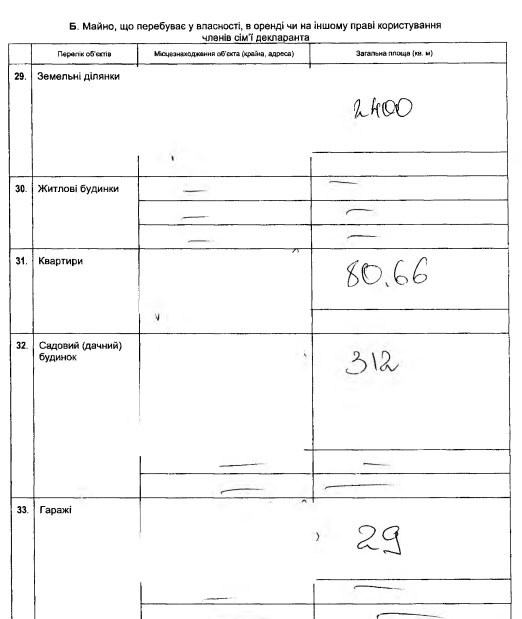 В собственности его семьи находится земучасток площадью 2 400 кв. м, квартира площадью в 80,6 кв. м, дачный дом в 312 кв. м и гараж, площадью в 29 кв. м.