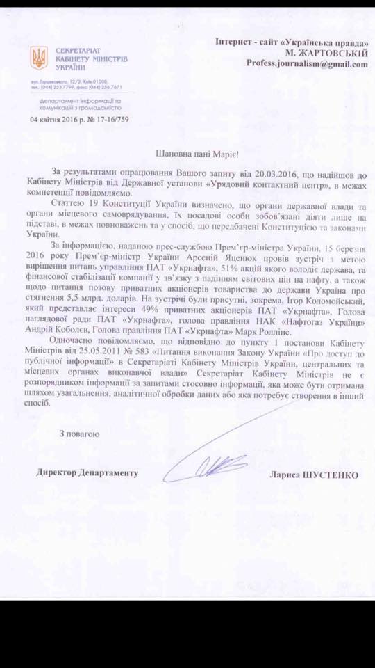 Следует отметить, что запрос в Кабмин "УП" направила 20 марта. Ответ пришел 4 апреля.