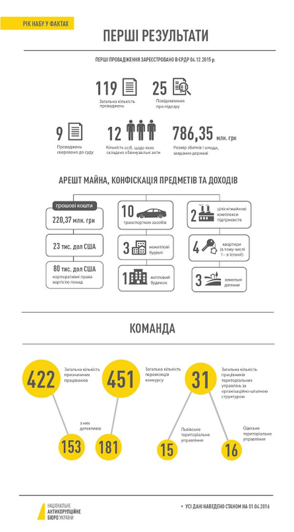 Национальное антикоррупционное бюро за время своей работы открыло порядка 120 уголовных производств, 9 дел в отношении 12 фигурантов передало в суд и вручило 25 сообщений о подозрении.