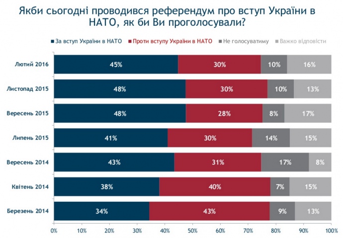 По состоянию на февраль 2016 года за вступление в НАТО готовы проголосовать 45% украинцев, против – 30%.