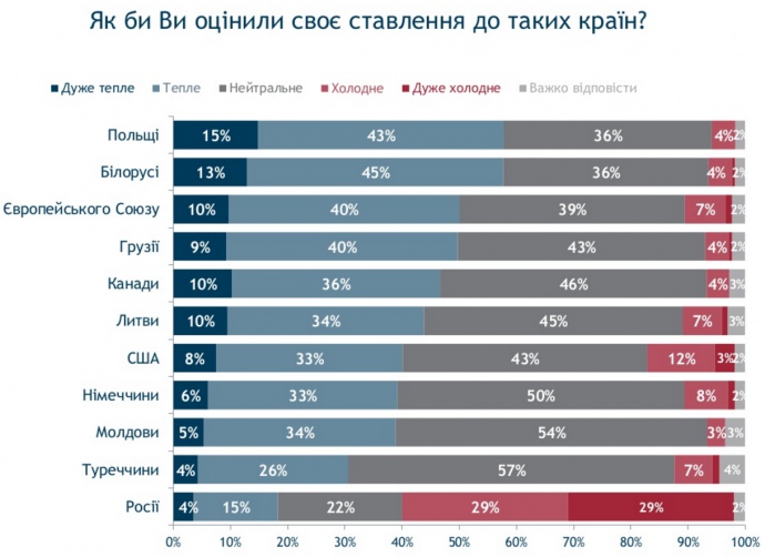 На дне рейтинга традиционно остается Россия. К ней очень тепло относятся лишь 4% украинцев, тепло – 15%, нейтрально – 22%, отрицательно и очень отрицательно – по 29%.