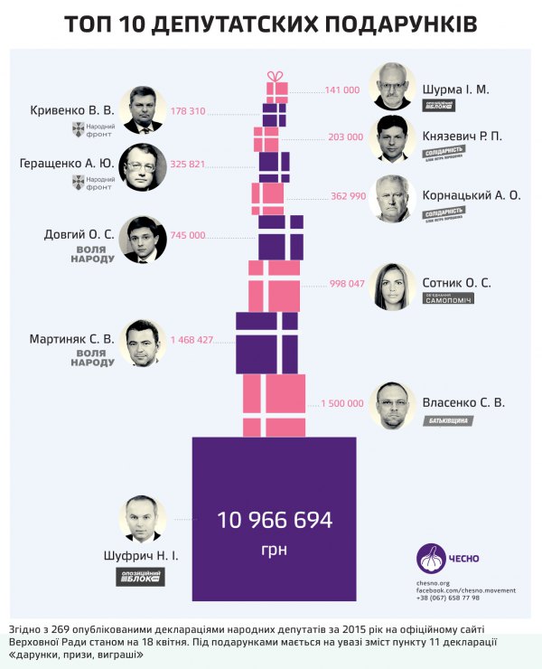 Подарки стоимостью свыше миллиона в 2015 году задекларировали Нестор Шуфрич ("Оппозиционный блок"), Сергей Власенко ("Батькивщина") и Сергей Мартыняк ("Воля народа").