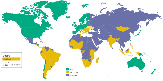 Украина все еще находится среди частично свободных стран, состояние свободы прессы в ней оценен в 53 пункта против 58 пунктов в прошлом году (чем ниже показатель, тем свободнее СМИ).
