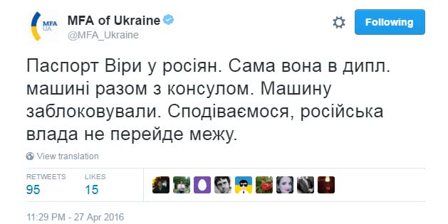 В то же время в Twitter-сообщении Министерства иностранных дел Украины говорится о том, что "Веру Савченко задержали в России".