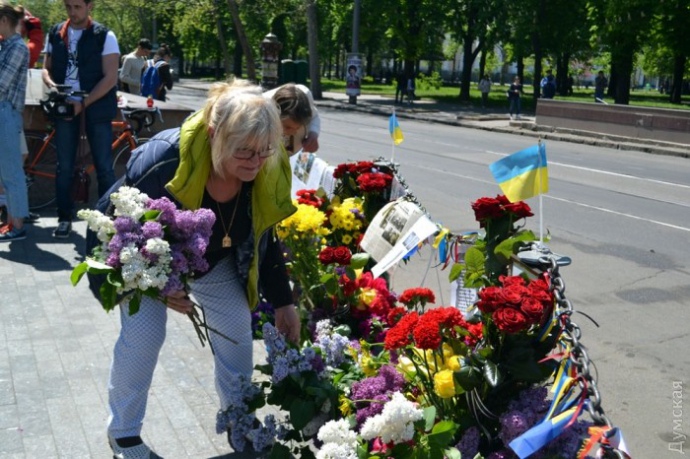 Люди пришли на Дерибасовскую угол Преображенской, чтобы возложить цветы на месте гибели погибших активистов Майдана Игоря Иванова и Андрея Бирюкова, которых застрелили 2-го мая 2014 года пророссийские боевики.