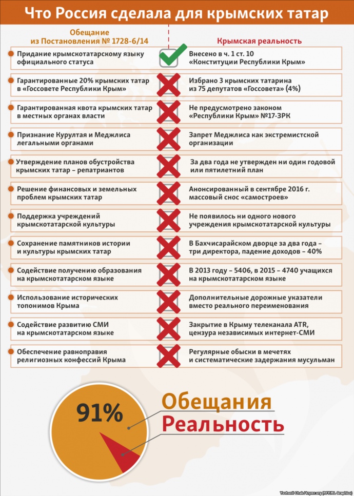Из двенадцати обещаний, которые оккупационная российская власть дала крымским татарам в 2014 году, через два года выполнено лишь одно, но и то - наиболее декларативное.