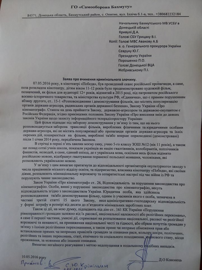 "Требую привлечь к ответственности организаторов "культурного" мероприятия из числа работников городского отдела образования, и предприятие владельца кинотеатра "Победа", которые своими действиями разжигают межнациональную рознь и сепаратистские настроения во время войны с РФ и нарушают действующее законодательство", - отмечает Кононец.