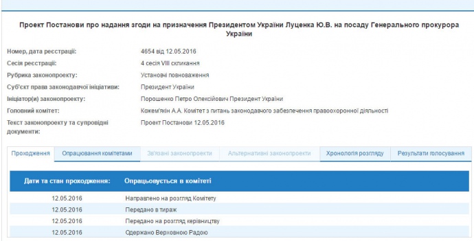 В Верховной Раде зарегистрировано постановление о предоставлении президенту разрешения на назначение Юрия Луценко генеральным прокурором.