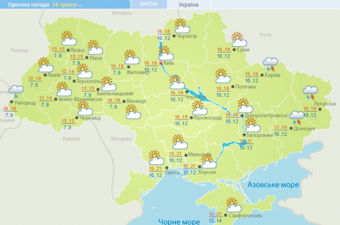 16 мая - без осадков, лишь в восточной части, Карпатах, Закарпатье, а днем и в Винницкой и Одесской областях небольшие дожди, грозы. Ветер преимущественно северо-западный, 5-10 м/с.
