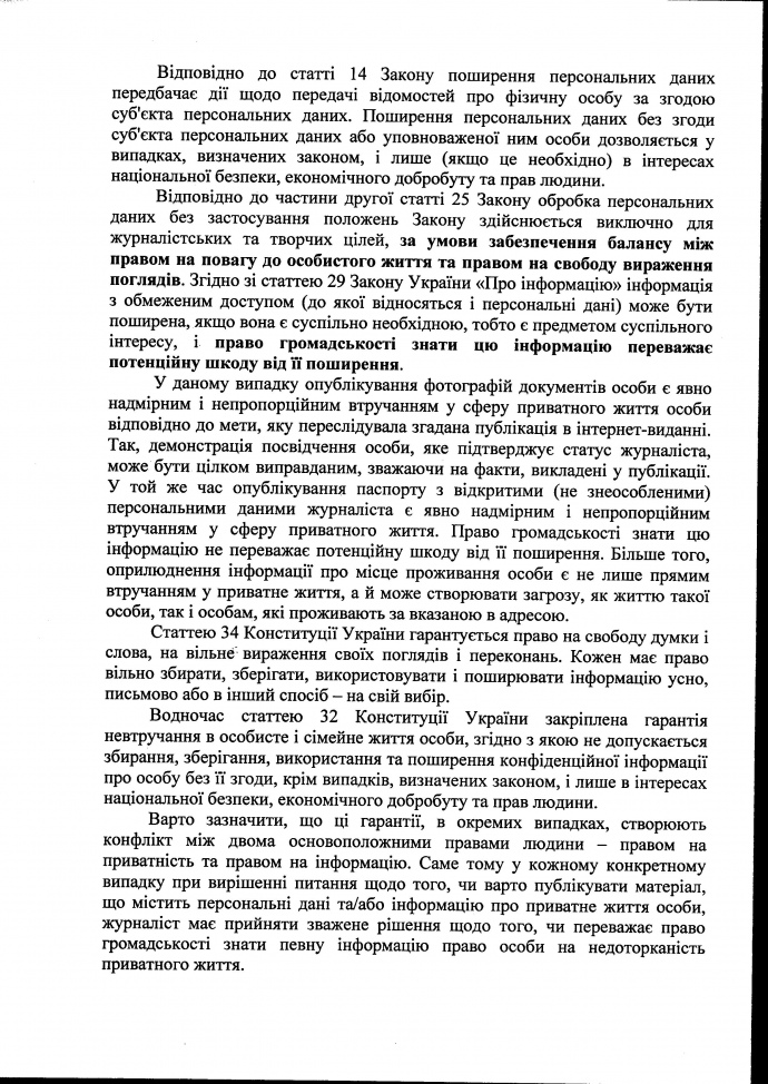 Лутковская считает, что опубликование фотографий документов человека было чрезмерным и непропорциональным вмешательством в сферу его частной жизни по сравнению с целью.