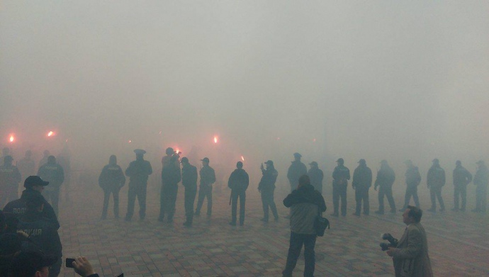 Участники марша "Азова", выступающие против проведения выборов на Донбассе до возвращения Украине контроля над границей, устроили дымовую завесу около Верховной Рады.