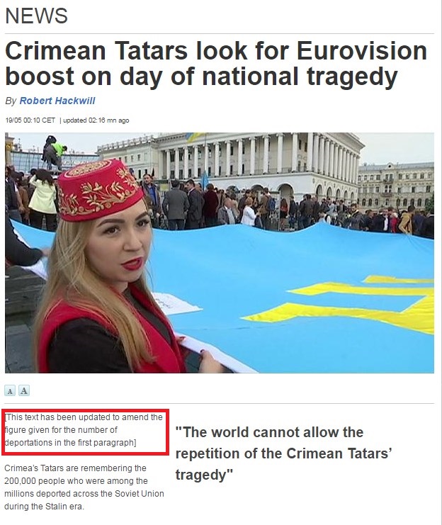 По ее словам, в материале о годовщине депортации крымских татар и памятные мероприятия в Киеве в русскоязычной версии статьи было указано, что в 1944 году из Крыма депортировали более 200 000 крымских татар, а в англоязычной версии - что более 2 миллионов человек.