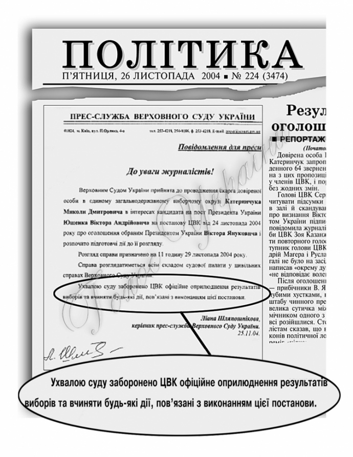 Также газета "Голос Украины" в 2004 году не публиковала сообщение о признании Януковича президентом, но опубликовала 26 ноября того года решение Верховного Суда Украины о запрете Центральной избирательной комиссии обнародовать результаты выборов.