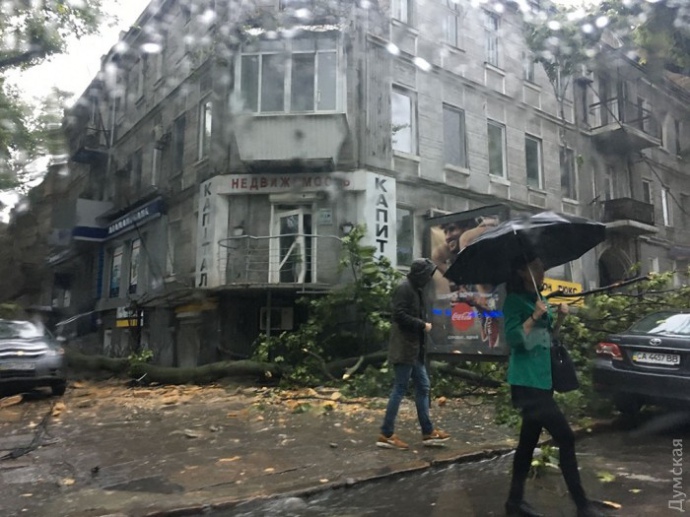 Местное издание "Думская" добавляет, что на перекрестке Пушкинской и Большой Арнаутской дерево упало на припаркованные автомобили.
