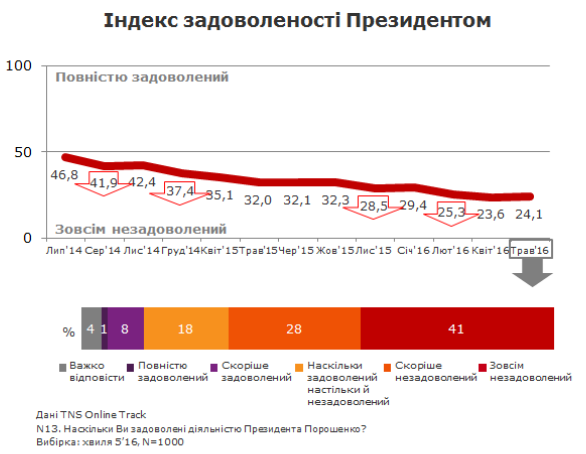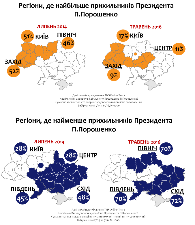 Что касается регионального распределения удовлетворенности деятельностью Порошенко, то по состоянию на май 2016 года наибольшее количество недовольных – среди жителей Восточного региона (суммарная доля тех, кто скорее недоволен совершенно недоволен – 72%), а тех, кто оценивает деятельность президента удовлетворительно – среди жителей Киева (суммарная доля тех, кто скорее удовлетворен и удовлетворен 17%).