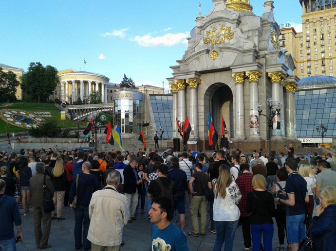 Активисты пришли на площадь в ответ на призыв, распространенный на странице ДУК "Правый сектор" в Facebook.