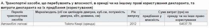 Согласно декларации за 2014 год, на аренду этого автомобиля он потратил около 65 тысяч грн.