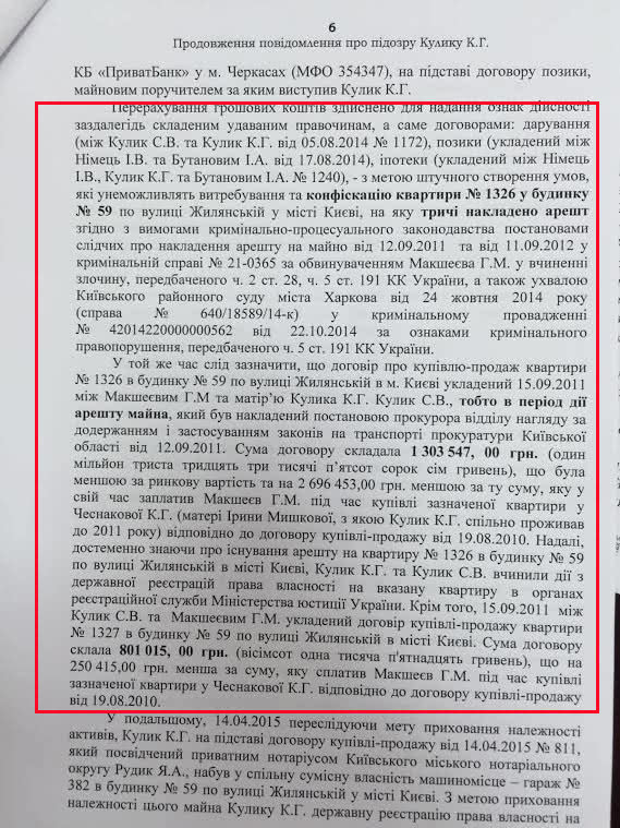 В подозрении отмечают, что Кулик также купил квартиру № 1326 на Жилянской, 59 у человека, который перед этим покупал ее у матери Ирины Мышковой, с которой Кулик проживал в 2011 году.
