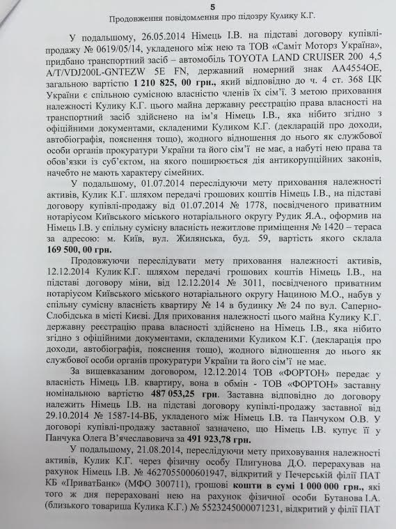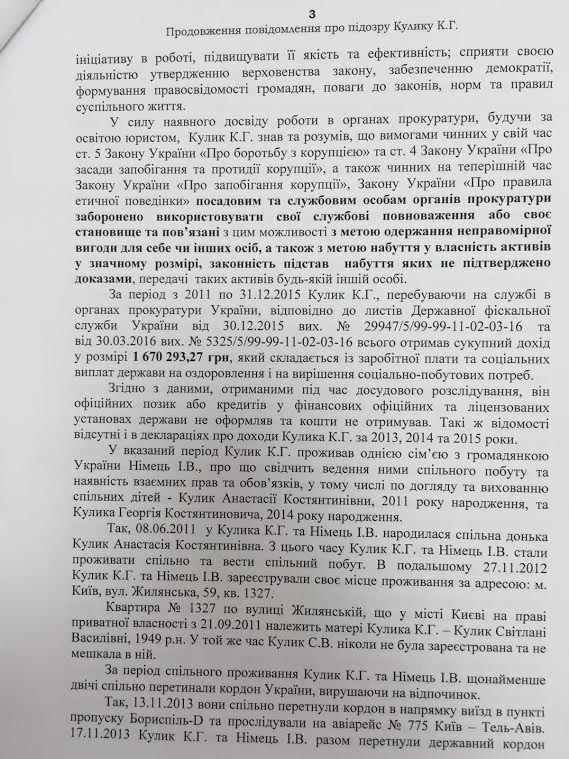 В документе отмечается, что "за период с 2011 по 31 декабря 2015 Кулик, работая в органах прокуратуры, согласно данным ДФС, получил совокупный доход в размере 1670 293,27 грн - зарплата, соцвыплаты государства на оздоровление и решение социально-бытовых потребностей. Официальных займов и кредитов не получил".