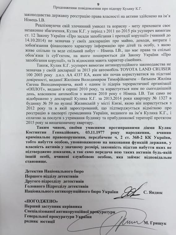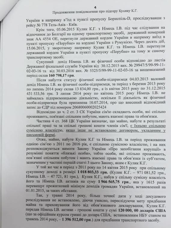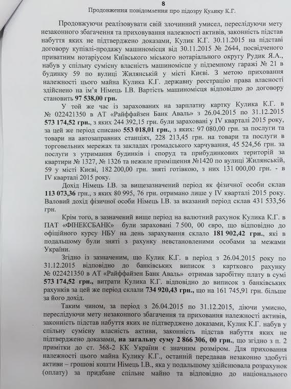 Далее, согласно документу, в период с 26 апреля 2015 по 31 декабря 2015 - с момента вступления в силу изменений УК о незаконном обогащении, Кулик получил в общую совместную собственность его и Нимец активы, законность которых не подтверждена доказательствами - в размере 286 6306 грн.
