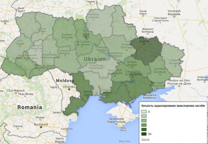 Среди областей по количеству заявленного мажоритарщиками транспорта лидируют Харьковская (49 транспортных средств), Херсонская (40), Запорожская (39) и Одесская (39).