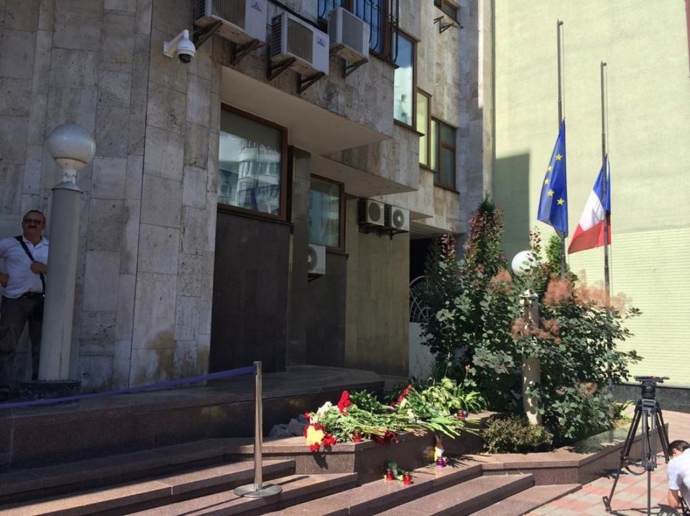 Украинцы в пятницу несут цветы к зданию посольства Франции в Киеве в память о погибших в результате теракта в Ницце.