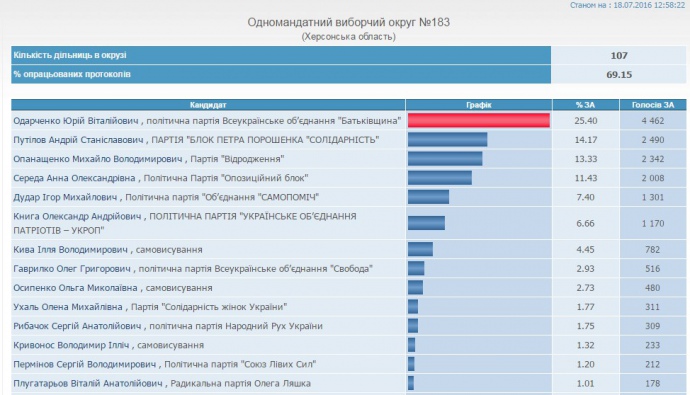 В избирательном округе №183 в Херсонской области, где обработали 69,15% протоколов, кандидат от "Батькивщины" Юрий Одарченко объявил себя победителем.