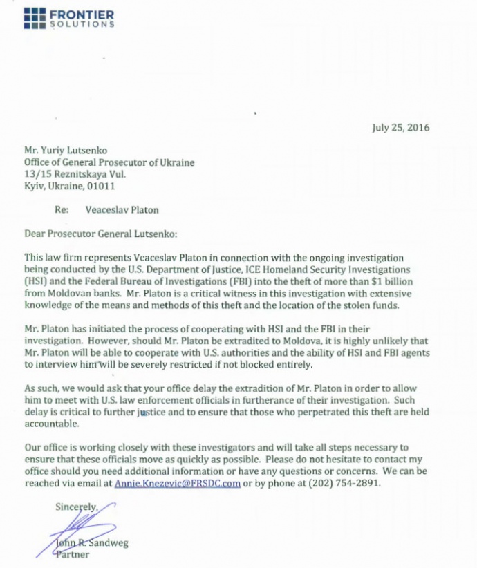 "Мистер Платон – ключевой свидетель в расследовании, которое проводят Минюст США, Таможенная полиция США, а также ФБР, относительно кражи более $1 млрд из молдовских банков. Он хорошо осведомлен о средствах и методах этой кражи, а также о местонахождении украденных денег", - говорится в письме защитников Платона.