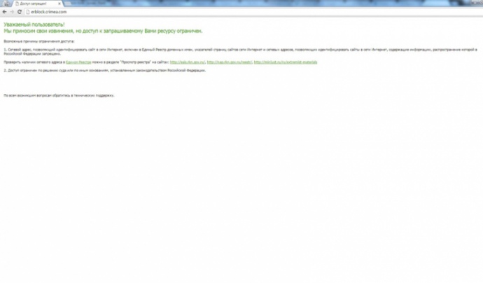 "Сетевой адрес, позволяющий идентифицировать сайт в сети Интернет, включен в Единый Реестр доменных имен, указателей страниц сайтов сети Интернет и сетевых адресов, позволяющих идентифицировать сайты в сети Интернет, содержащие информацию, распространение которой в Российской Федерации запрещено", – говорится в сообщении, которое появляется на экране, при попытке зайти на сайт.