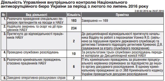 Об этом говорится в отчете НАБУ о результатах деятельности за период с февраля по август 2016 года, опубликованном в правительственном курьере 10 августа.