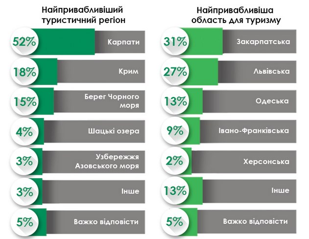 Согласно полученным результатам 52% опрошенных назвали Карпаты привлекательным туристическим регионом. 18% таким считают Крым.