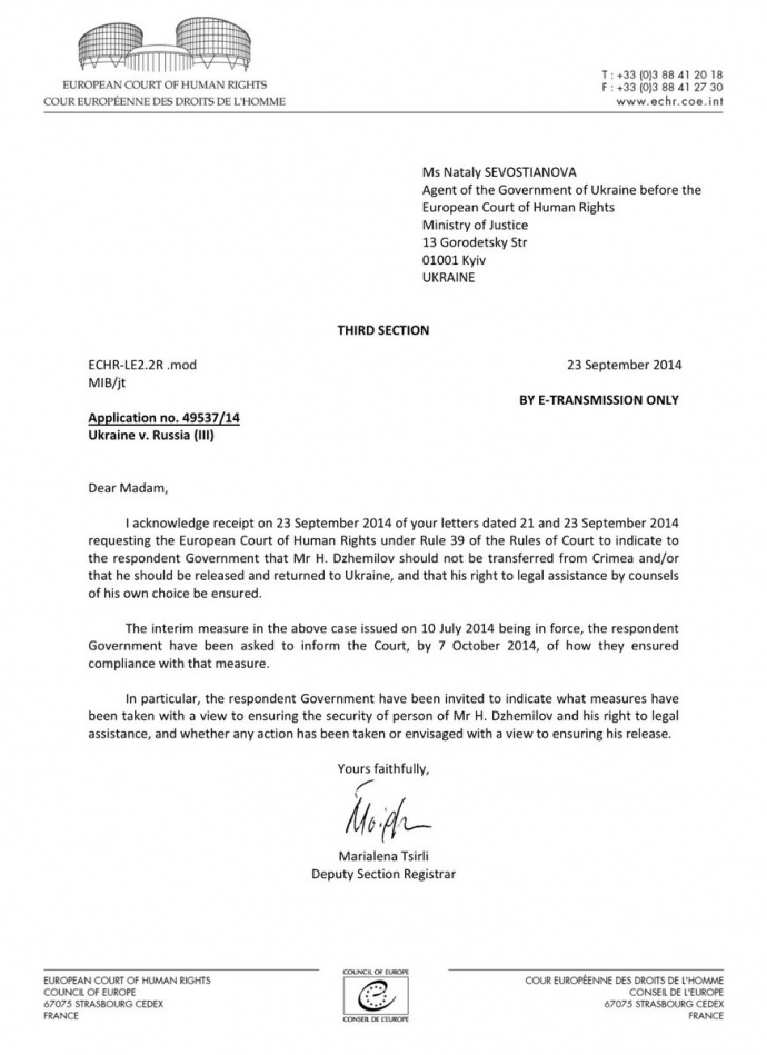 10 июля 2015 Европейский суд по правам человека постановил освободить Хайсер Джемилева из СИЗО. Однако Россия не отреагировала на это решение.