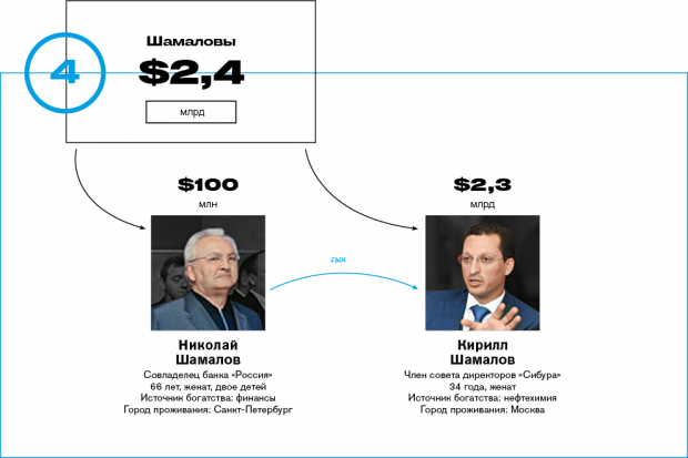 Основой состояния давнего знакомого президента Путина Шамалова-старшего является пакет в 10,2% акций банка "Россия", у его сына – доля в "Сибуре" (крупнейший нефтехимический холдинг России – ред.)