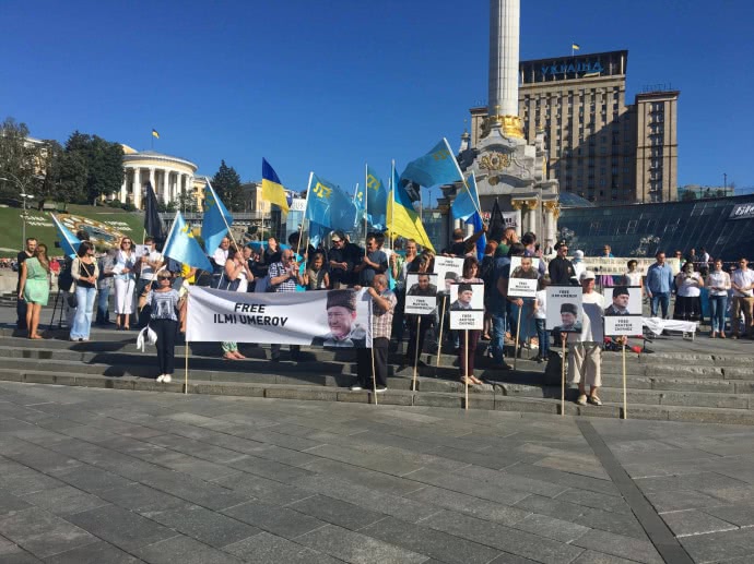 На Майдане Независимости в Киеве проходит акция с требованием освободить заместителя главы Меджлиса крымскотатарского народа Ильми Умерова, который находится в российском плену в Крыму.