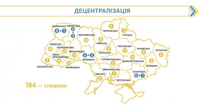 В настоящее время в Украине создано 184 объединенных территориальных общины.