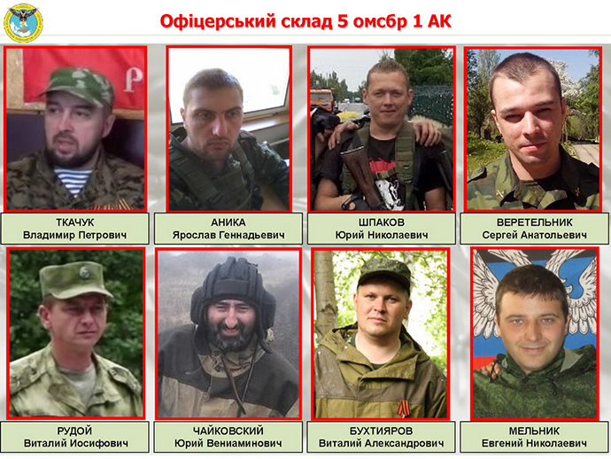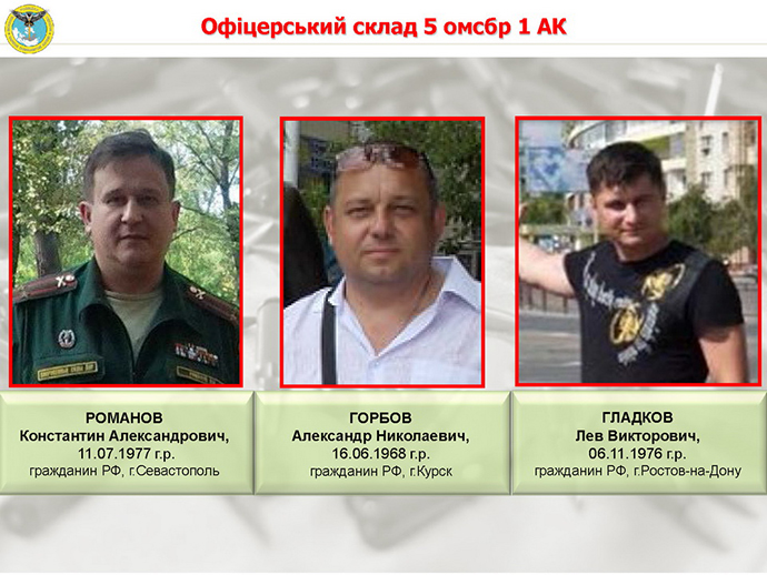 Главное управление разведки Миноброны идентифицировано офицерский состав 5 отдельной мотострелковой бригады (воинская часть 08805, г. Макеевка) 1 АК (Донецк) Центра территориальных войск (Новочеркасск) Южного военного округа (Ростов-на-Дону) вооруженных сил Российской Федерации.