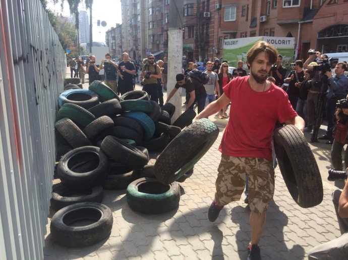 Под здание телеканала "Интер" привезли шины.