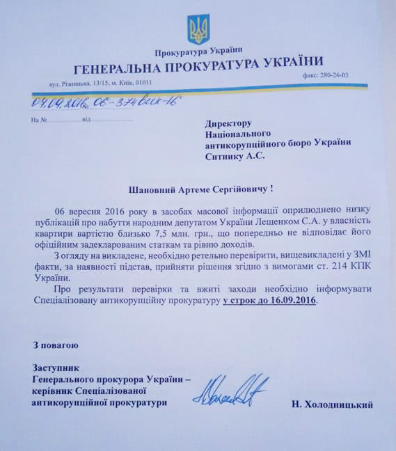 "Поручил НАБ Украины проверить информацию, изложенную в средствах массовой информации относительно законности приобретения в собственность народным депутатом Сергеем Лещенко квартиры в городе Киеве", – говорится в сообщении.