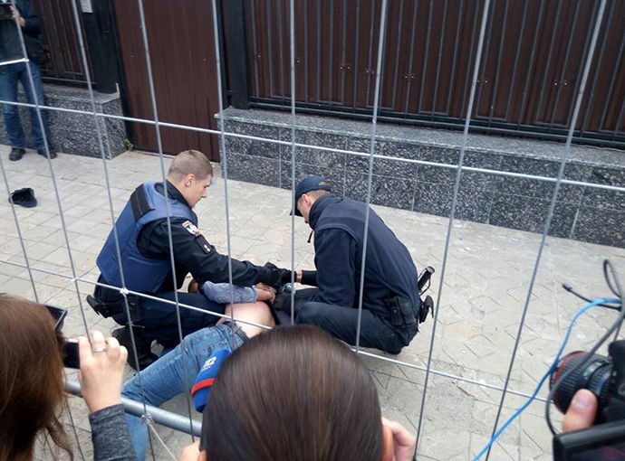Как видно из трансляции, после задержания Назаренко активисты повредили заградительную сетку возле посольства.