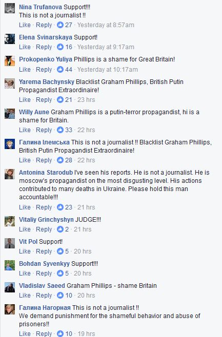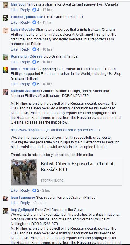 "Мы, международное мировое сообщество, почтительно призываем Вас расследовать и преследовать господина Филлипса в полном объеме законов Великобритании за его связи с террористами и незаконную деятельность на оккупированной Украине", – говорится в некоторых других комментариях.