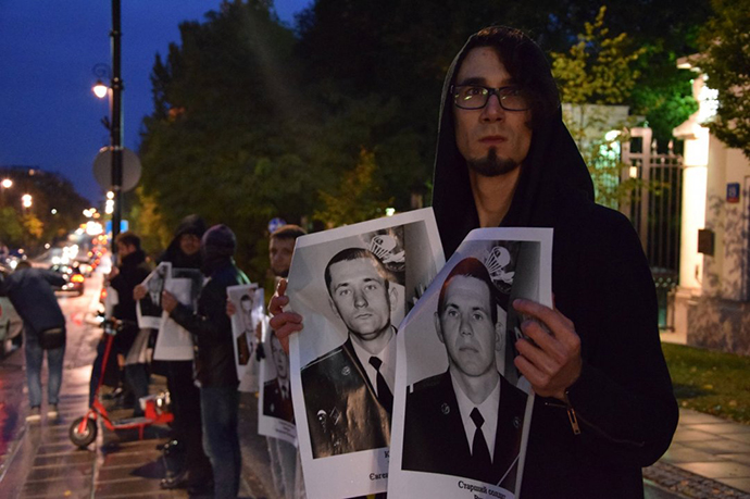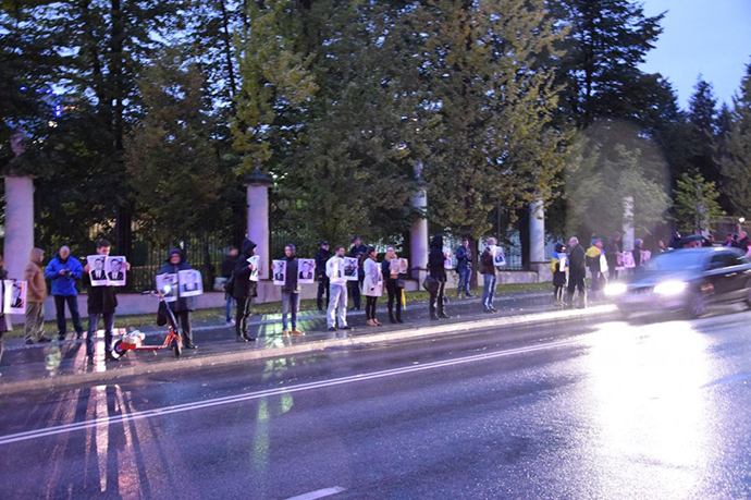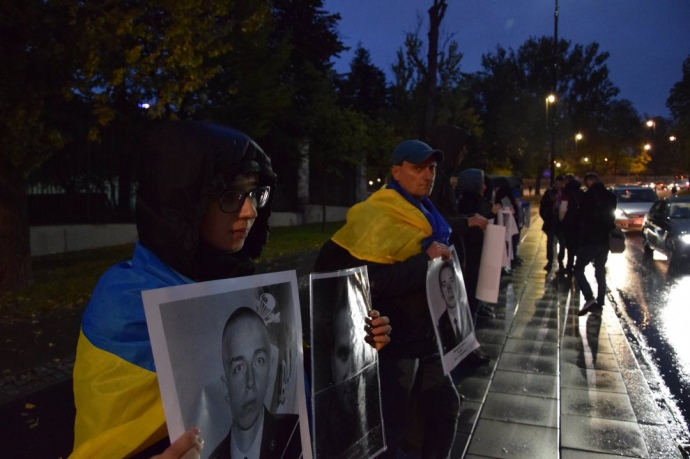 Несколько украинцев в черной одежде в пятницу вечером развернули перед посольством России в Варшаве фотографии украинских воинов, погибших на востоке в результате агрессии России в Украине.