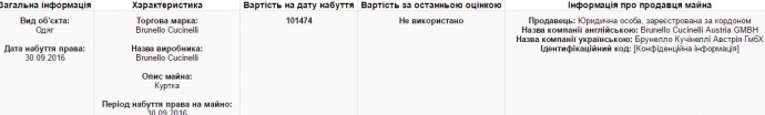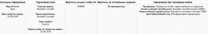 Согласно данным об изменениях имущественного положения, 30 сентября он приобрел две куртки Brunello Cucinelli. Одну - за 101 474 гривни, вторая - за 174 164 гривны.