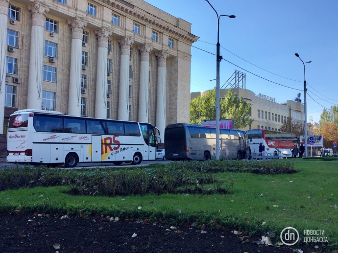 При этом в городе развешены билборды с изображением "Моторолы" и лозунгом "Герои не умирают", который использоваться при прощании с погибшими на Майдане в Киеве и сейчас при прощании с украинскими военными.