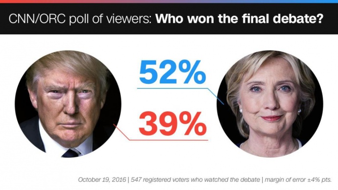 Как известно, Хиллари Клинтон победила в первых дебатах с Трампом: по опросу телеканала CNN, Клинтон поддержали 62% зрителей, Трампа - 27%. Во втором туре дебатов Клинтон поддержали 57% опрошенных, Трампа - 34%.