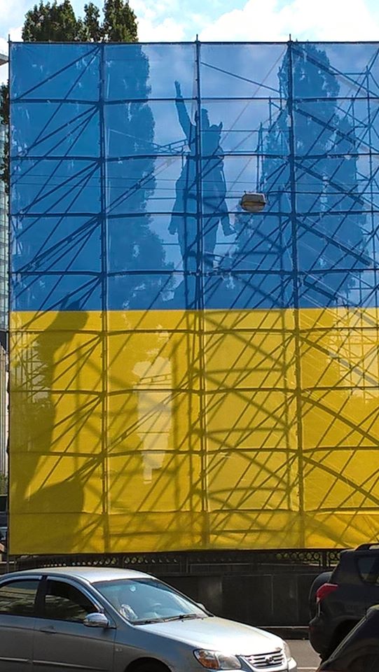 Ко Дню независимости Украины памятник был закрыт со всех сторон украинским флагом, в таком состоянии он находится до сих пор.
