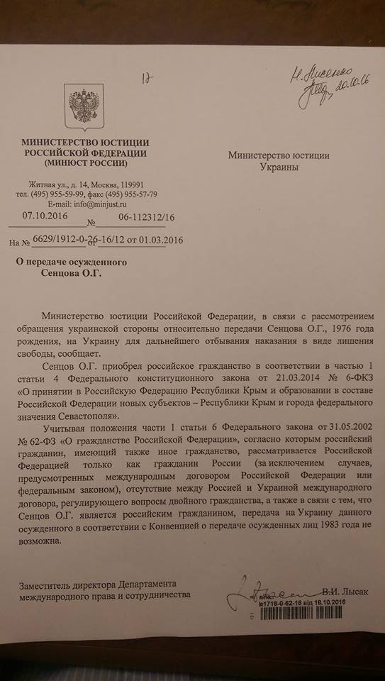 Главным основанием для отказа в выдаче Сенцова Россия назвала то, что "Сенцов является гражданином Российской Федерации".