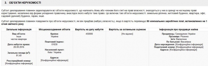 Чиновник указал в электронной декларации за 2015 год, что получил в подарок от матери Валентины Розенко квартиру в Киеве площадью 81,4 кв. м стоимостью 450 тысяч гривен. Права на часть квартиры он обрел 28 сентября этого года.